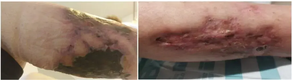 A primeira imagem mostra múltiplas placas com livedo e ulcerações circunferenciais e escara necrótica aderida. A segunda imagem mostra evolução favorável